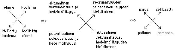 Schleifer on kiinnostunut siitä, mitä naisen seksuaalisuus merkitsee patriarkaatille tällaisen jaottelun kannalta. Schleifer toteaa jaarittelevaan tapaansa: Not only does this square suggest that male adultery is "natural" as opposed to culturally determined sexuality, and as such that it defines sexuality in what I will describe (following Greimas) as the "explosive" position of the square, a position which positions female sexuality - which reconceives it - as both unnatural and a constant threat to conjugal love (Schleifer 1987, xxi-xxii). Schleiferin huomio on mielenkiintoinen tutkittaessa homouden ja selibaatin merkitystä patriarkaatille. Vaikka molemmat koetaan heteroseksuaalisessa sukupuolimoraalissa negatiivisiksi, liittyy niihin myös myyttistä ihanteellisuutta. Kummassakaan naisen seksuaalisuus ei uhkaa miehen rakkautta. Richard Barton on tutkinut eroksen merkitystä tarkemmin. Hänen neliössään halu edustaa kuolemaa, koska patriarkaatille sukupuolinen vaisto on uhka järjelle. Bartonin kaaviossa maskuliinisuus, sosiaalinen kontrolli ja järki ovat tiiviisti toisiinsa kytkettyjä. Kaaviossa 3 on vasemmalla Bartonin esittelemä erikoistapaus, genderanalyysi "Kuolema Venetsiassa" -teoksen pohjalta (Barton 1985, 128) ja oikealla analyysin pohjalta kehitelty tulkinta (Mt., 137).